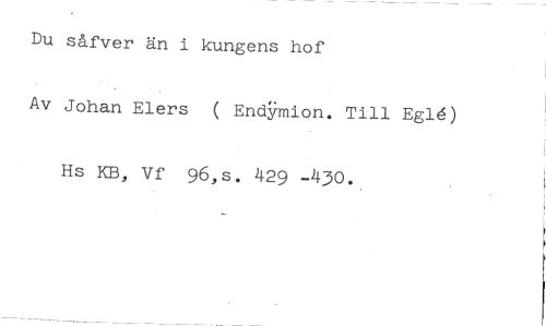 Du såfver än i kungens hof //// Av Johan Elers ( EndYmion. Till EgaA) Hs KB, Vf 96,s. 429 -430.