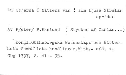 Du Stjerna Nattens vän : som ljusa Strålar //// sprider //// Av P/eter/ P.Ekelund ( Stycken af Ossian...) //// Kongl.Götheborgska Wetenskaps och Witterhets Samhällets handlingar.Witt.- afd. 4. Gbg 1797, S. 81 - 95.