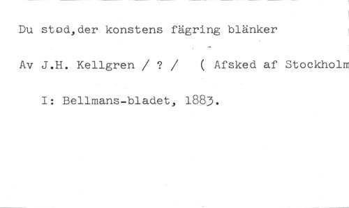 Du stod,der konstens fägring blänker //// Av J.H. Kellgren / ? / ( Afsked af Stockholm I: Bellmans-bladet, 1883.