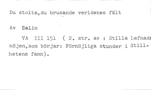 Du stolta,du brusande verldenes fält Av Dalin //// VA III 151 ( 2. str. av : Stilla Lefnad! nöjen,som börjar: Förnöjliga stunder i Stillhetens famn).