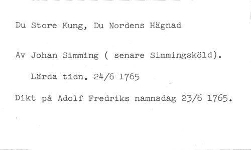 Du Store Kung, Du Nordens Hägnad //// Av Johan Simming ( senare Simmingsköld). Lärda tidn. 24/6 1765 //// Dikt på Adolf Fredriks namnsdag 23/6 1765.