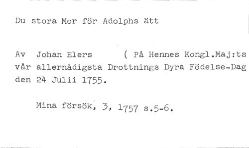 Du stora Mor för Adolphs ätt //// Av Johan Elers ( På Hennes Kongl.Maj:ts //// vår allernådigsta Drottnings Dyra Födelse-Dag den 24 Julii 1755. //// Mina försök, 3, 1757 s.5-6.