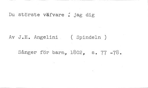Du störste väfvare : jag dig //// Av J.E. Angelini ( Spindeln ) //// Sånger för barn, 1802, s. 77 -78.