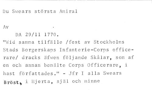 Du Swears största Amiral //// Av //// DA 29/11 1770. //// "Wid samma tilfälle /fest av Stockholms Stads Borgerskaps Infanterie-Corps officerare/ dracks äfwen följande Skålar, som af en och annan bemälte Corps Officerare, i hast författades." - Jfr I alla Swears Bröst i Hjerta, själ och minne