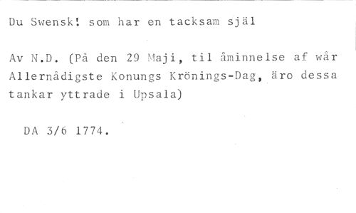 Du Swenskt som har en tacksam själ //// Av N.D. (På den 29 Maji, til åminnelse af wår Allernådigste Konungs Krönings-Dag, äro dessa tankar yttrade i Upsala) //// DA 3/6 1774.