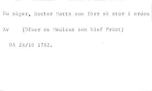 Du säger, Doctor Matts som förr så stor i orden //// Av (Öfwer en Medicus som blef Präst) //// DA 28/10 1782.