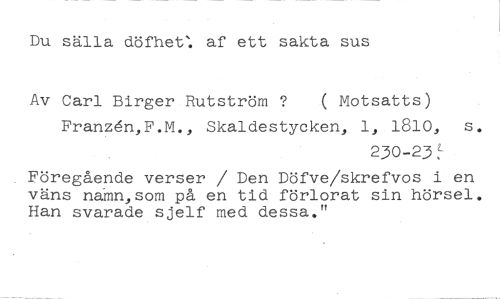 Du sälla döfhet: af ett sakta sus //// Av Carl Birger Rutström ( Motsatts) //// Franz&I,F.M., Skaldestycken, 1, 1810, s. //// 230-23 //// Föregående verser / Den Döfve/skrefvos i en väns nåån,som på en tid förlorat sin hörsel. Han svarade sjelf med dessa."