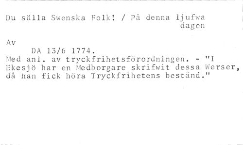 Du sälla Swenska Folk! / På denna ljufwa //// dagen //// Av //// DA 13/6 1774. //// Med anl. av tryckfrihetsförordningen. - "I Ekesjö har en Medborgare skrifwit dessa Werser, då han fick höra Tryckfrihetens bestånd."