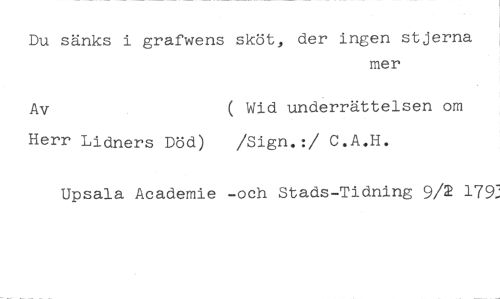 Du sänks i grafwens sköt, der ingen stjerna //// mer //// Av ( Wid underrättelsen om //// Herr Lidners Död) /Sign.:/ C.A.H. //// Upsala Academie -och Stads-Tidning 9/2 179: