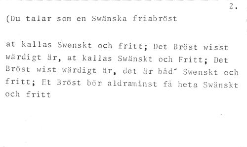 2. //// (Du talar som en Swänska friabröst //// at kallas Swenskt och fritt; Det Bröst wisst wärdigt är, at kallas Swänskt och Fritt; Det Bröst wist wärdigt är, det är båd' Swenskt och fritt; Et Bröst bör allraminst få heta Swänskt och fritt