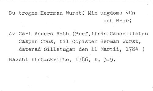 Du trogne Herrnian Wurst: Min ungdoms vän //// och Bror: //// Av Carl Anders Roth (Bref,ifrån Cancellisten Casper Crus, til Copisten Herman Wurst, daterad Gillstugan den 11 Martii, 1784 ) //// Bacchi strö-skrifte, 1786, s. 3-9.