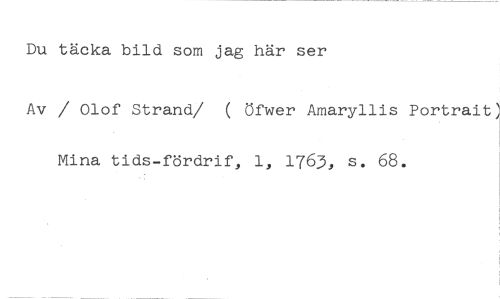 Du täcka bild som jag här ser //// Av / Olof Strand/ ( Öfwer Amaryllis Portrait) //// Mina tids-fördrif, 1, 1763, s. 68.