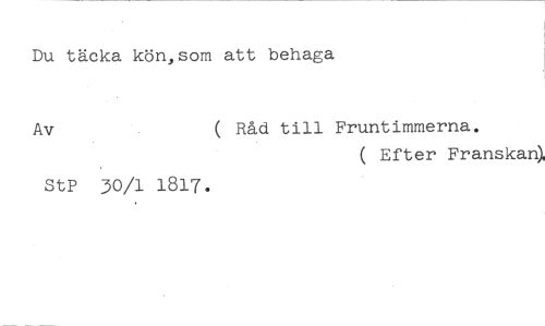 Du täcka kön,som att behaga //// Av ( Råd till Fruntimmerna. //// ( Efter Franskan), //// StP 30/1 1817.