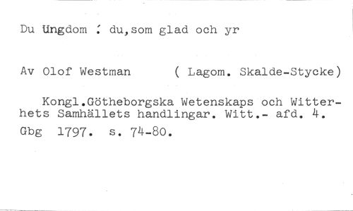 Du Ungdom : du,som glad och yr //// Av Olof Westman ( Lagom. Skalde-Stycke) //// Kongl.Götheborgska Wetenskaps och Witterhets Samhällets handlingar. Witt.- afd. 4. //// Gbg 1797. s. 74-80.
