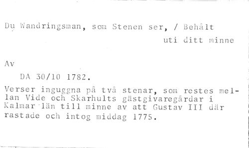 Du Wandringsman, som Stenen ser, / Behålt //// uti ditt minne //// Av //// DA 30/10 1782. //// Verser inguggna på två stenar, som restes mellan Vide och Skarhults gästgivaregårdar i Kalmar-län till minne av att Gustav III där rastade och intog middag 1775.