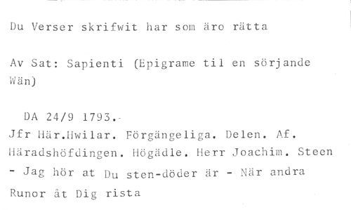 Du Verser skrifwit har som äro rätta //// Av Sat: Sapienti (Epigrame til en sörjande IV än) //// DA 24/9 1793.- //// Jfr Här.Hwilar. Förgängeliga. Delen. Af. Häradshöfdingen. Högädle. Herr Joachim. Steen //// - Jag hör at Du sten-döden är - När andra Runor åt Dig rista