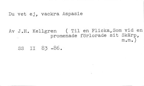 Du vet ej, vackra Aspasie //// Av J.H. Kellgren ( Til en Flicka,Som vid en //// promenade förlorade sit Skärp, //// m.m•) //// ss II 83 -86.