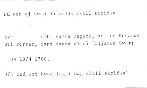 Du wet ej hwad du städs skall skrifwa //// Av (Uti samma Dagbok, som en Resande //// uti versal., fans dagen därpå följande Swar) //// DA 10/4 1780. //// Jfr Gud wet hwad jag i dag skall skrifwa!