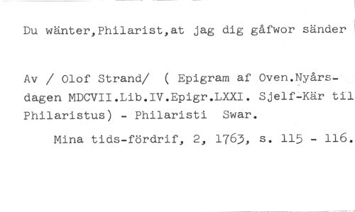 Du wänter,Philarist,at jag dig gåfwor sänder //// Av / Olof Strand/ ( Epigram af Oven.Nyårsdagen MDCVII.Lib.IV.Epigr.LXXI. Sjelf-Kär til Philaristus) - Philaristi Swar. //// Mina tids-fördrif, 2, 1763, s. 115 - 116.