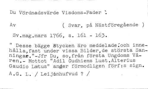 Du Vördnadsvärde Visdoms-Fader //// Av ( Svar, på Nästföregående ) //// Sv.mag.mars 1766, s. 161 - 163. //// " Desse bägge Stycken äro meddelade och innehålla,fast under vissa Bilder,de största Sanningae."-Jfr Du, so,från första Ungdoms Våren.- Mottot "Adil Gudhiems Lust.Alterius Gaudio Laetus" anger förmodligen förf:s sign. //// A.G. L. / Leijånhufvud //// /
