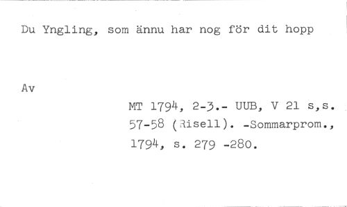Du Yngling, som ännu har nog för dit hopp //// Av //// MT 1794, 2-3.- UUB, V 21 s,s. 57-58 (Aisell). -Sommarprom., //// 1794, s. 279 -280.
