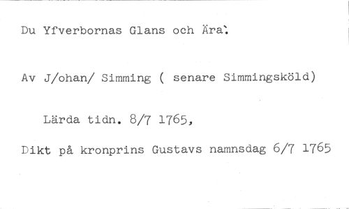 Du Yfverbornas Glans och Ära: //// Av J/ohan/ Simming ( senare Simmingsköld) //// Lärda tidn. 8/7 1765, //// Dikt på kronprins Gustavs namnsdag 6/7 1765