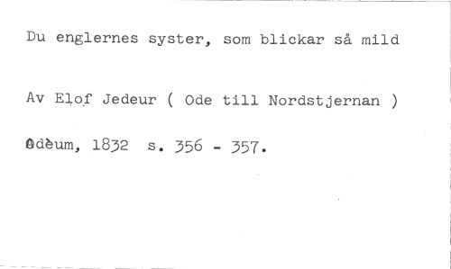 Du englernes syster, som blickar så mild //// Av Elof Jedeur ( Ode till Nordstjernan ) //// Adhum, 1832 s. 356 - 357.