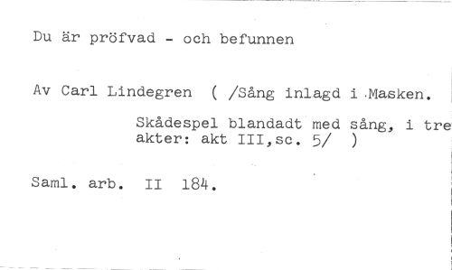 Du är pröfvad - och befunnen //// Av Carl Lindegren ( /Sång inlagd i.Masken. //// Skådespel blandadt med sång, i tre //// akter: akt III,sc. 5/ ) //// Saml. arb. II 184.