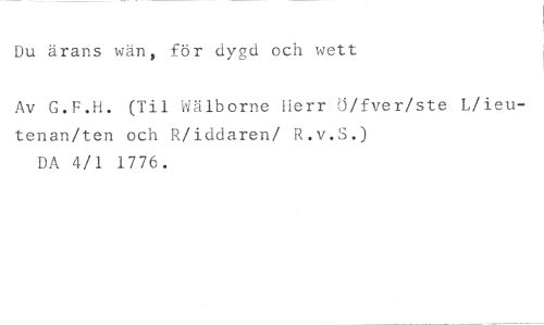 Du ärans för dykt och wett //// Av G.F.H. (Til Wälborne Herr Ö/fver/ste L/ieutenan/ten och R/iddaren/ R.v.S.) DA 4/1 1776.