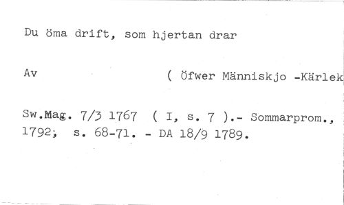 Du öma drift, som hjertan drar //// ( Öfwer Människjo -Kärlek, //// Sw.Mag. 7/3 1767 ( 1, s. 7 ).- Sommarprom., 1792; s. 68-71. - DA 18/9 1789.
