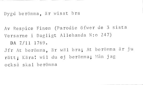 Dygd berömma, är wisst bra //// Av Respice Finem (Parodie öfwer de 3 sista Versarne i Dagligt Allehanda N:o 247) DA 7/11 1769. //// Jfr At berömma, är wäl bra; At berömma är ju rätt; Kära! wil du ej berömma; Mån jag också skal berömma
