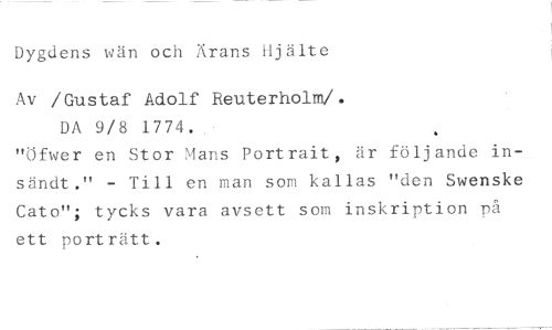 Dygdens wän och Ärans Hjälte //// Av /Gustaf Adolf Reuterholm/. //// DA 9/8 1774., //// "ifwer en Stor Mans Portrait, är följande insändt." - Till en man som kallas "den Swenske Cato"; tycks vara avsett som inskription på ett porträtt.