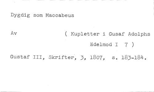 Dygdig som Maccabeus //// Av ( Kupletter i Gusaf Adolphs //// ädelmod I 7 ) //// Gustaf III, Skrifter, 3, 1807, s. 183-184.