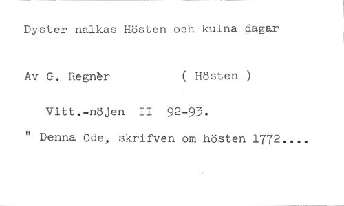 Dyster nalkas Hösten och kulna dagar //// Av G. Regnbr ( Hösten ) //// Vitt.-nöjen II 92-93. //// " Denna Ode, skrifven om hösten 1772....