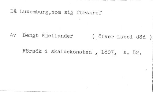 Då Luxemburg,som sig förskref //// Av Bengt Kjellander ( öfver Lusci död ), //// Försök i skaldekonsten , 1807, s. 82.