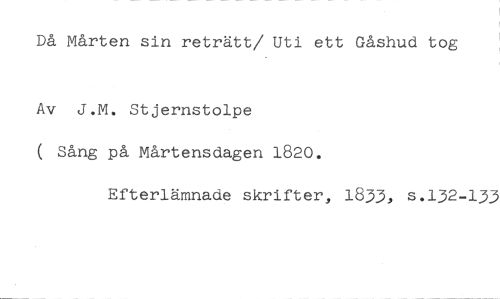 Då Mårten sin reträtt/ Uti ett Gåshud tog //// Av J.M. Stjernstolpe //// ( Sång på Mårtensdagen 1820. //// Efterlämnade skrifter, 1833, s.132-133