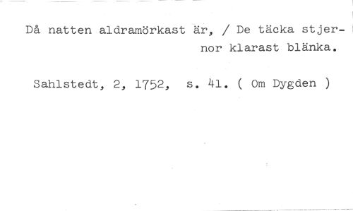 Då natten aldramörkast är, / De täcka stjer- //// nor klarast blänka. //// Sahlstedt, 2, 1752, s. 41. ( Om Dygden )