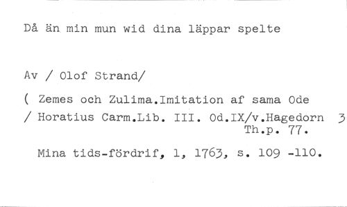 Då än min mun wid dina läppar spelte //// Av / Olof Strand //// /( Zemes och Zulima.Imitation af sama Ode //// / Horatius Carm.Lib. III. Od.IX/v.Hagedorn 3 //// Th.p. 77. //// Mina tids-fördrif, 1, 1763, s. 109 -110.