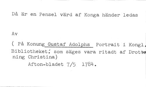 Då är en Pensel värd af Konga händer ledas //// Av //// ( På Konung Gustaf Adolphs Portrait i Kongl //// Bibliotheket: som säges vara ritadt af Drott ning Christina) //// Afton-bladet 7/5 1784.