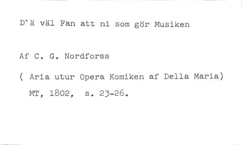 D'ä väl Fan att ni som gör Musiken //// Af C. G. Nordforss //// ( Aria utur Opera Komiken af Della Maria) MT, 1802, s. 23-26.