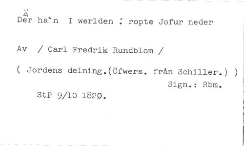 4 //// Der han I werlden ropte Jofur neder Av / Carl Fredrik Rundblom //// /( Jordens delning.(Öfwers. från Schiller.) ) //// Sign.: Rbm. //// StP 9/10 1820.