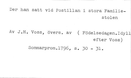 Der han satt vid Postillan i stora Familie- //// stolen //// Av J.H. Voss, övers. av ( Födelsedagen.Idyll //// efter Voss) //// Sommarprom.1796, s. 30 - 31.