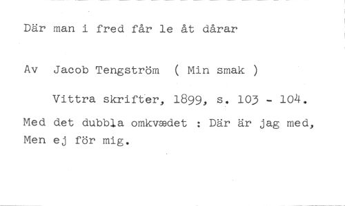 Där man i fred får le åt dårar //// Av Jacob Tengström ( Min smak ) //// Vittra skrifter, 1899, s. 103 - 104. //// Med det dubbla omkvmdet : Där är jag med, Men ej för mig.