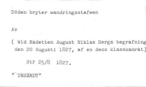 Döden bryter wandringsstafwen Av //// ( Wid Kadetten August Niklas Bergs begrafning den 20 Augusti 1827, af en dess klasskamrat) //// StP 25/8 1827. 1NSÄNDT"