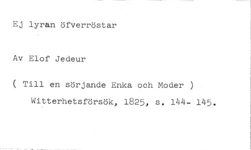 Ej lyran öfverröstar //// Av Elof Jedeur //// ( Till en sörjande Enka och Moder ) Witterhetsförsök, 1825, s. 144- 145.