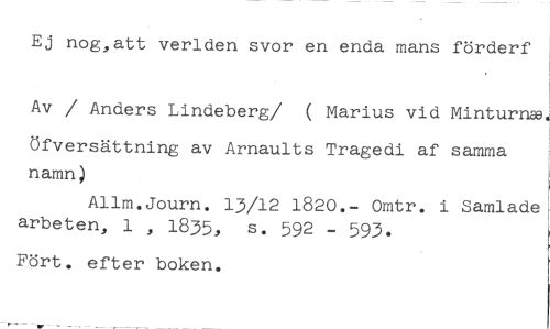 Ej nog,att verlden svor en enda mans förderf Av / Anders Lindeberg/ ( Marius vid Minturnse //// Öfversättning av Arnaults Tragedi af samma namn) //// Allm.Journ. 13/12 1820.- Omtr. i Samlade arbeten, 1 , 1835, s. 592 - 593. //// Fört. efter boken.