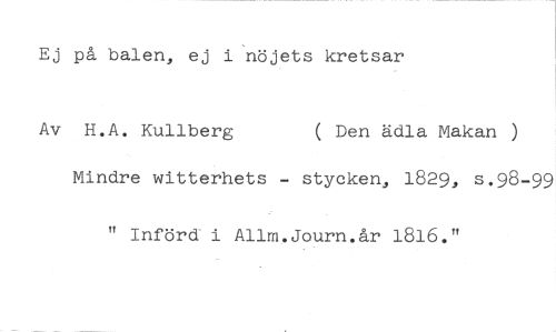 Ej på balen, ej i nöjets kretsar //// Av H.A. Kullberg ( Den ädla Makan ) //// Mindre witterhets - stycken, 1829, s.98-99 //// " Införd i Allm.Journ.år 1816."
