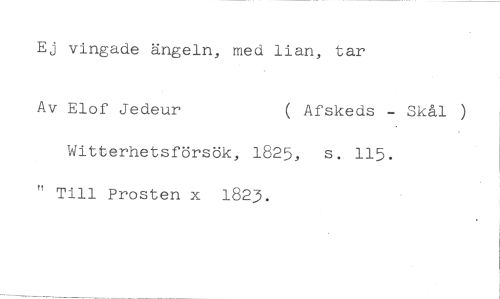 Ej vingade ängeln, med lian, tar //// Av Elof Jedeur ( Afskeds - Skål ) //// Witterhetsförsök, 1825, s. 115. " Till Prosten x 1823.