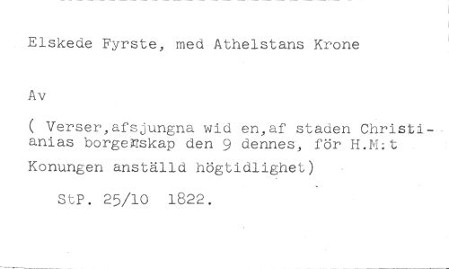 Elskede Fyrste, med Athelstans Krone Av //// ( Verser,afsjungna wid en,af staden Christianias borgenskap den 9 dennes, för H.M:t //// Konungen anställd högtidlighet) StP. 25/10 1822.