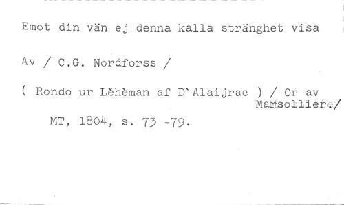 Emot din vän ej denna kalla stränghet visa Av / C.G. Nordforss //// /( Rondo ur Lähbman af D'Alaijrac ) / Or av //// MaMsolIiete //// /MT, 1804, s. 73 -79.